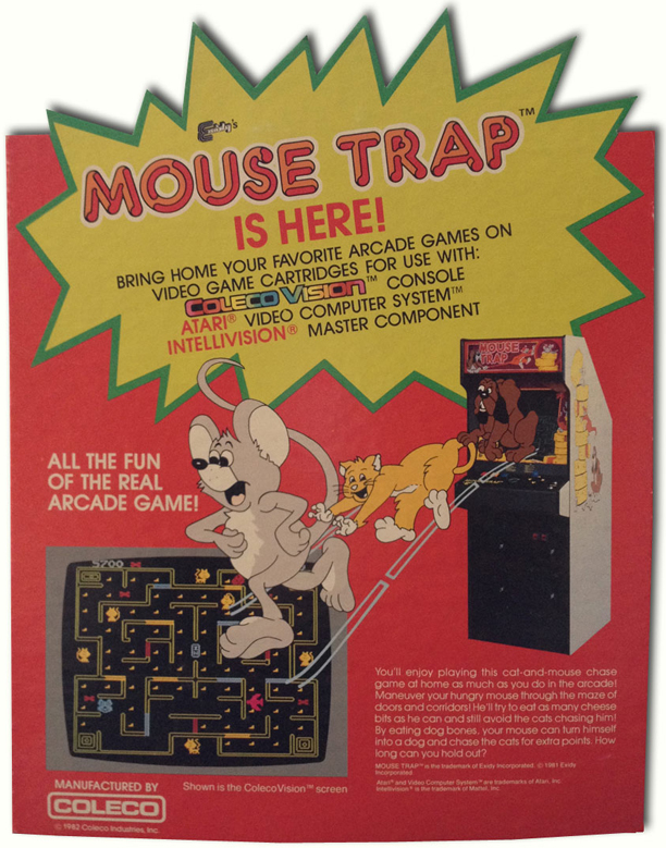 The game cartridge counter card displays were distributed to promote the games. These imaginatively illustrated 8½" x 11" counter cards are themed to show the close tie-in between the actual arcade games and the Coleco home versions of them. They include selling information on the game and also alert customers of the systems (ColecoVision™, Atari® VCS or Intellivision®) for which Coleco made them available.